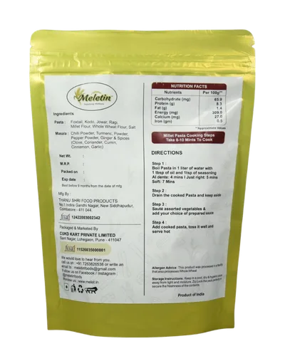 Millet Pasta—a flavorful, wholesome, and low-GI alternative to regular pasta. Made with Foxtail, Kodo, Jowar & Ragi Millet Flour and whole wheat Flour (no maida / preservatives / color), and includes a masala mix. Great for digestion, diabetics, and kids.